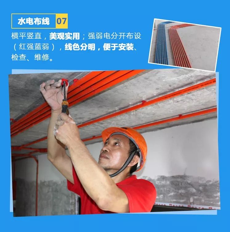 為了更好的規(guī)范電路工程,確保工程品質,及監(jiān)理與業(yè)主對電工項目的檢查與驗收,星藝裝飾特創(chuàng)雙色電工套管,采用優(yōu)質的阻燃型有色PVC管作強、弱電線保護管材。紅色——強電及照明用電專用,藍色——弱電項目專用。強、弱電線管交叉時,弱電線管應用錫箔紙作纏繞屏蔽處理,預防信號干擾。更多工藝細節(jié),歡迎預約參觀星藝工地。