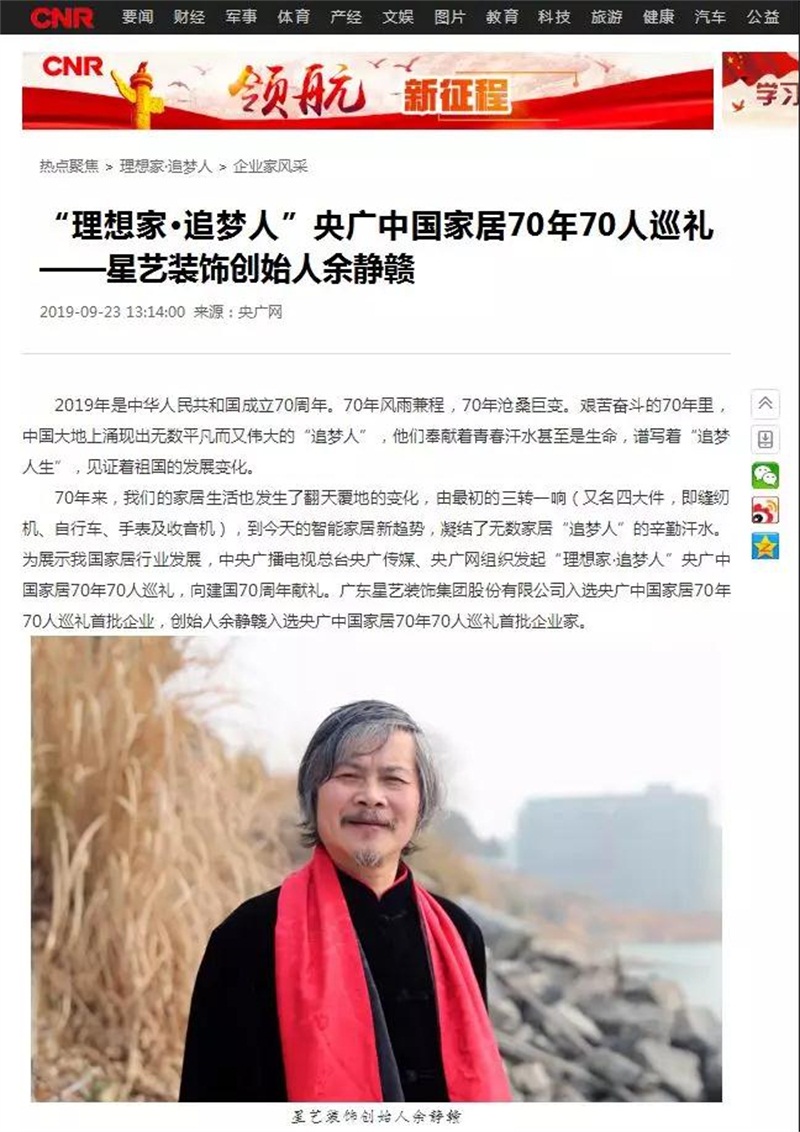 導(dǎo)讀:廣東星藝裝飾集團(tuán)有限公司入選央廣中國(guó)家居70年70人巡禮首批企業(yè),創(chuàng)始人余靜贛入選央廣中國(guó)家居70年70人巡禮首批企業(yè)家。